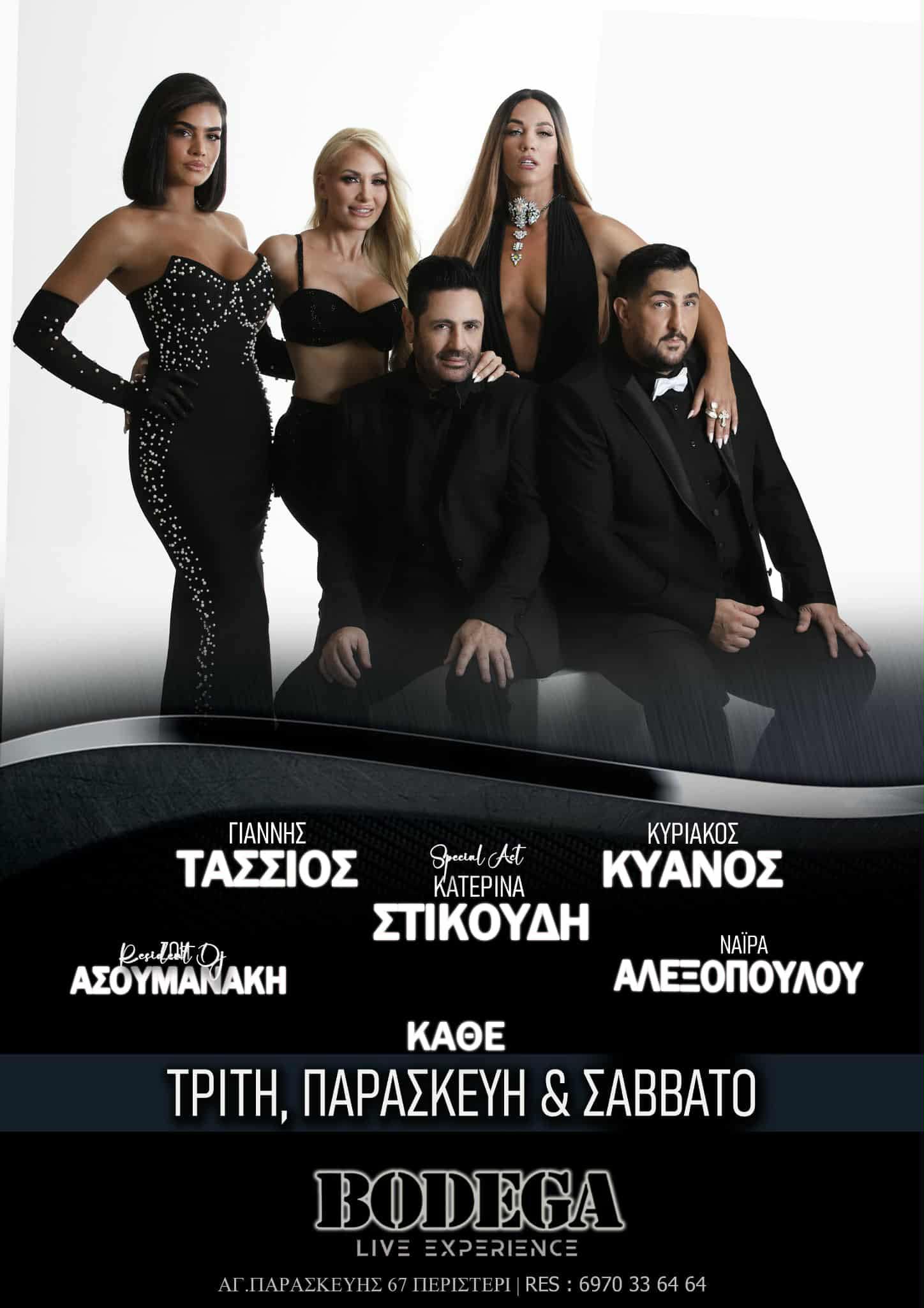 Φέτος, το Bodega παρουσιάζει ένα σχήμα-φωτιά που υπόσχεται να απογειώσει τη νυχτερινή διασκέδαση της Αθήνας σε ένα εντελώς νέο επίπεδο! Στη σκηνή ανεβαίνουν ο Γιάννης Τάσσιος και ο Κυριάκος Κυανός, δύο αυθεντικές λαϊκές φωνές που έχουν αφήσει το δικό τους ανεξίτηλο στίγμα στη μουσική σκηνή. Μαζί τους, η εκρηκτική και πολυτάλαντη Κατερίνα Στικούδη, το αγαπημένο και πάντα κεφάτο συγκρότημα Vegas με τον μοναδικό pop-urban ήχο του, και η εντυπωσιακή Ναϊρα Αλεξοπούλου που προσδίδει μια ξεχωριστή ενέργεια σε κάθε της εμφάνιση.